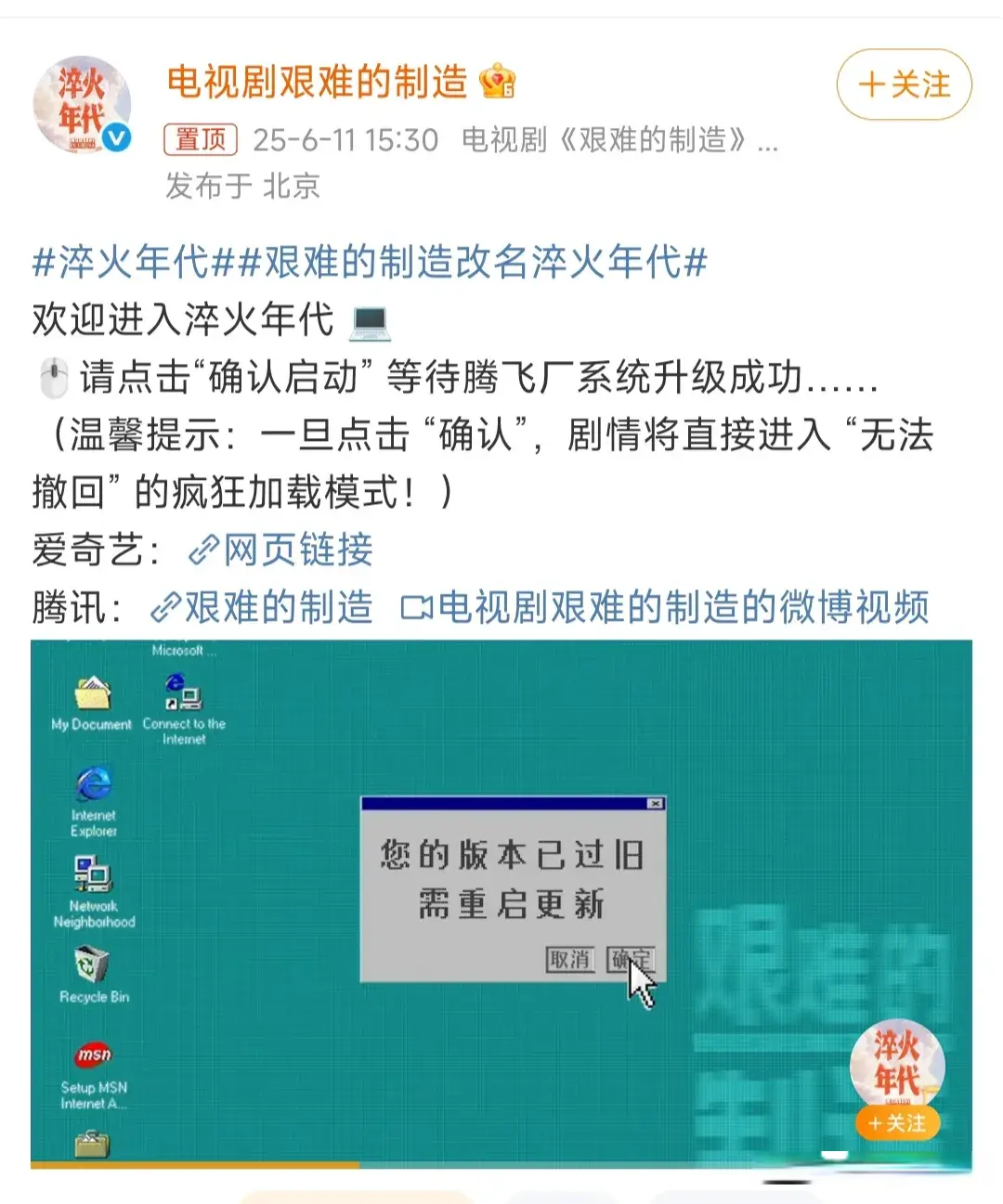 爱奇艺平台即将上线,正午阳光新剧,由宋祖儿、张新成、王彦霖等主演的电视剧《艰难的制造》正式官宣更名为《淬火年代》,6月中旬左右腾讯视频爱奇艺双平台播出,并上星央一黄金档播出。暂定6月17日左右上线,期待早日定档了。